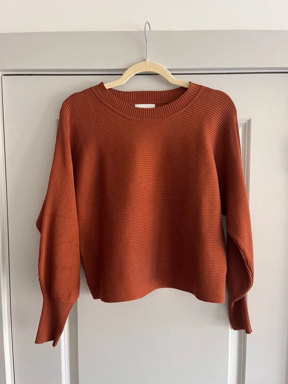 Cozy ribbed sweater with a relaxed crew neckline. Subtle balloon sleeves for a modern touch. Soft, lightweight knit ideal for layering. Easy to style with casual or dressy outfits.