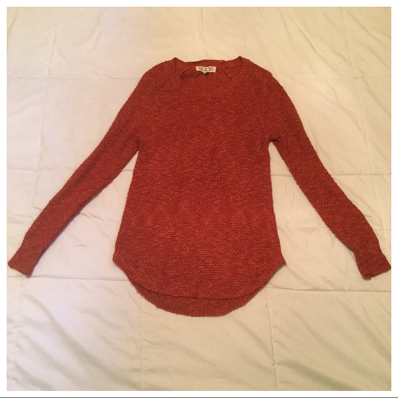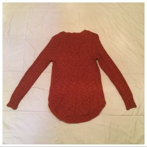 Lightweight and comfortable rust colored sweater with a scoop neck and high low hem. Measures armpit to armpit 15”, sleeve length 29”, shoulder to hem in front 27”, shoulder to hem in back 29”