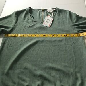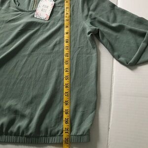NWT zip back, scoop neck top, with elastic waist and sleeves. Measurements laid flat are shown in pictures. 97% polyester, 3% spandex. Machine wash cold, lay flat to dry.