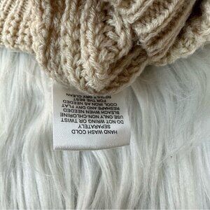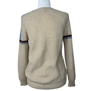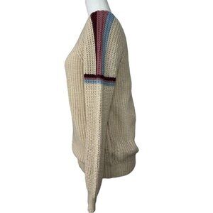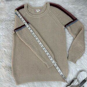 Pink Rose women’s size medium sweater, it is tan in color, ribbed knit, long sleeves, crew neck, trendy striped shoulders with purple, rose and blue colors, slightly oversized, stretchy, and medium-weight fabric. Materials 100% acrylic. Care hand wash cold dry flat. Condition is preloved very good as shown in pictures. Please preview the measurements to ensure fit. Size 6 dress form used in photos.