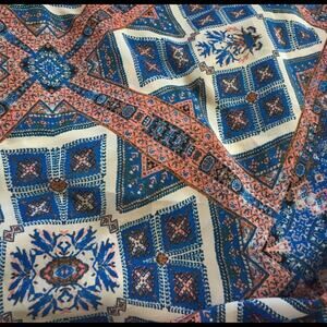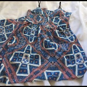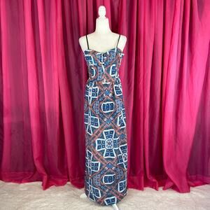 Pink Rose graphic print maxi dress in a size Large. Colors are blue, white, and salmon pink. Features include lightly padded cups, adjustable straps, and smocked back. Bust is 37", waist 32", both have nice stretch ability. Length is 56". Falls past the floor on me when not wearing heels.