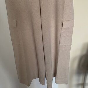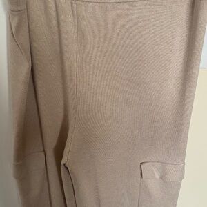 Pink Rose knitted pants set. Pants were altered to 37" from waist. There is an additional 3" to let down if needed. Rayon and polyester. Hand wash or dry clean. Pants have two patch pockets.