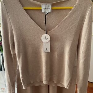 Top is Vee neck; long sleeved; short . Both pieces never worn. Top has a few minor pulls that are not visible. Size is XL, but it fits a Large.