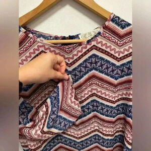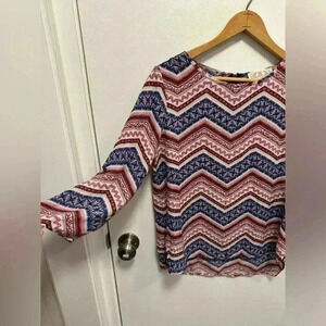 Very cuter and silky feeling pullover top by Pink Rose in size small. Red, white, black and blue zig zag pattern with a quarter zip on the back made of 100% polyester. Pre-owned and in good condition.