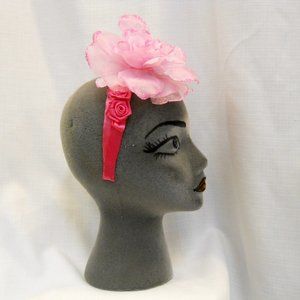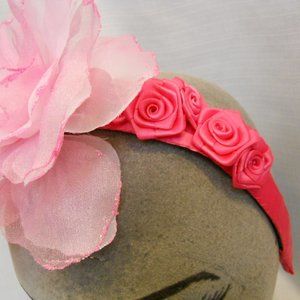 Pretty hand made headband with little satin rosettes and topped off with a large, lighter colored sheer rose. There's some sparkling glitter on the edges of the large rose. New item, made in Los Angeles by Owl Talk. Perfect for any fun or fancy event!