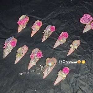 Size M. One of a kind nail art set(11 nails) enhance your style with this pink roses nail art set. One extra nail design for alternate. Will include jelly glue that the press on nails were able to be reusable.