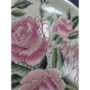Pink Roses Plate Crackled Vintage Green Leaves Enameled 10.25''D Decorative