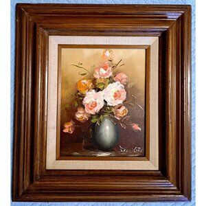 Pink Roses Still Life Oil Painting 17"x 14.5" Framed Matted Signed From Mexico