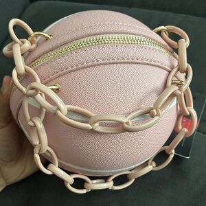 Stylish pink round bag with bold lettering. Perfect for making a statement.