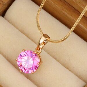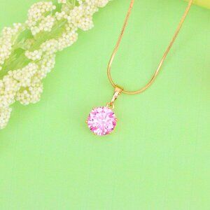 Glamorous pink pendant with a brilliant round-cut stone in a rose gold prong setting—perfect for feminine flair and elegant styling.