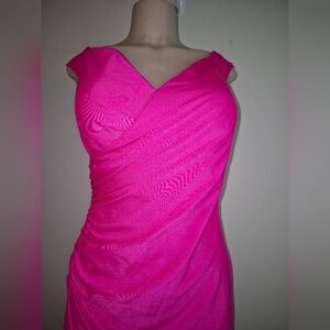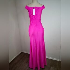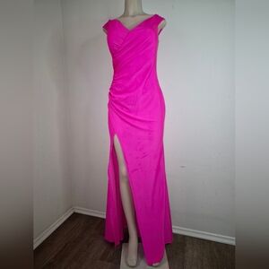 This striking pink dress boasts an off-the-shoulder neckline and a captivating asymmetrical design. The ruched detailing and dramatic side slit enhance its elegant silhouette, making it an ideal choice for prom or a glamorous night out.