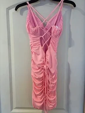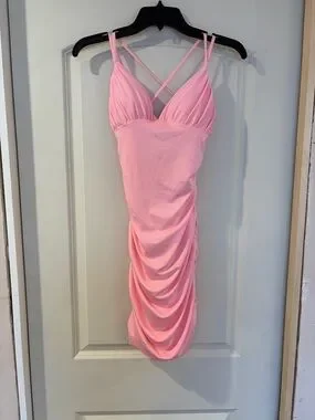 Brand new, never worn, no tags. Soft pink bodycon dress with ruched skirt. Spaghetti straps with crisscross back detail. Fitted silhouette for a sleek look. Versatile for day or night wear.