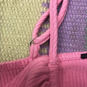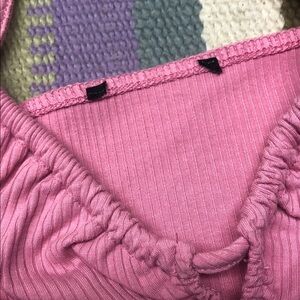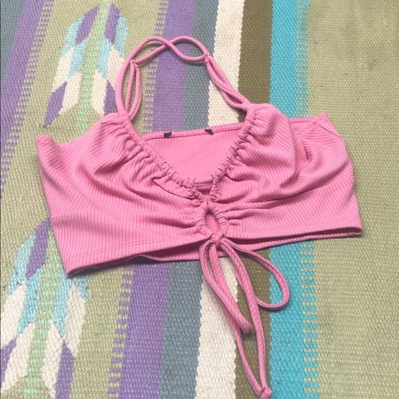 Stylish pink ruched crop top with adjustable straps. Perfect for casual outings.