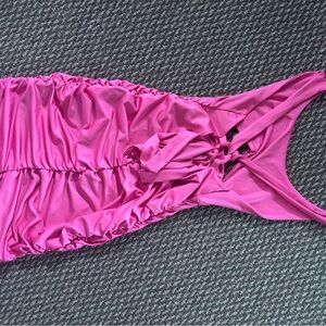 Stylish pink ruched dress with sleeveless design. Perfect for a night out.