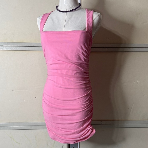 Chic pink mini dress with ruched detailing. Perfect for a night out.