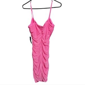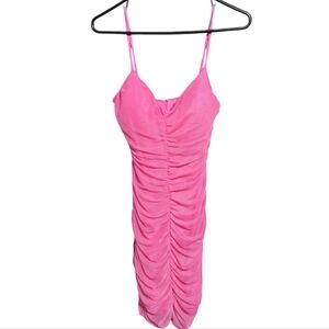 This vibrant pink mini dress features a stylish ruched design, perfect for a night out. Its flattering fit and bold color make it a standout piece in any wardrobe.