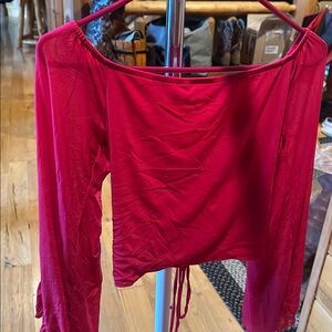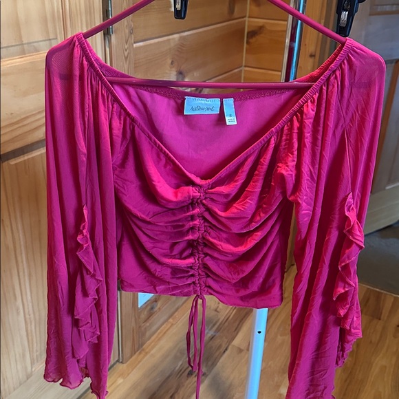 Stylish pink ruched off-shoulder top with ruffled sleeves.Reddish pink