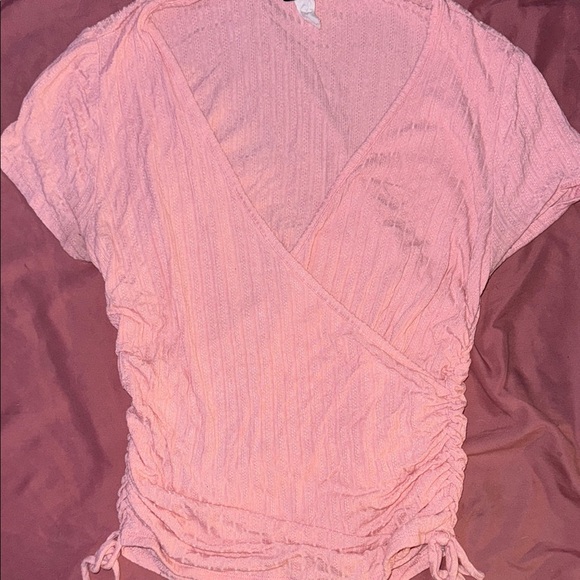 Chic and stylish pink wrap top perfect for any occasion. Features a flattering design with side ties for a custom fit.