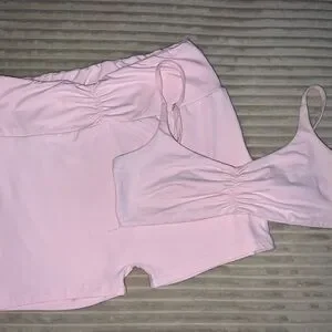 Stylish pink two-piece set with ruched details. Includes a crop top and shorts.