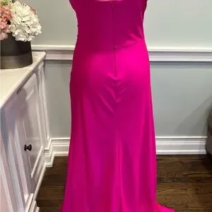 This stunning pink dress features a flattering wrap design with ruched detailing and side slit perfect for a night out. The sleeveless style with spaghetti straps and a sweetheart neckline adds a touch of elegance. Its vibrant color and sleek silhouette make it a standout choice for cocktail events.