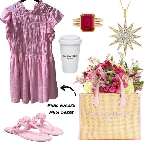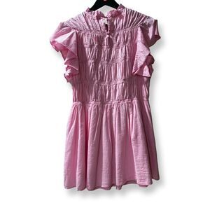 Pink Ruched Midi Dress. This is a fun pink 100% cotton dress with elastic rushing from the hips to the shoulders. It features a cap fluttered sleeve, and there is a small lining on the interior from the hips down that is made of a stretch mesh material. The back features a two button keyhole closure.
