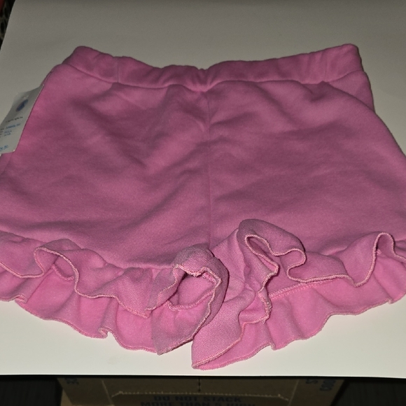 Soft pink baby shorts with layered ruffle hem. Elastic waistband for comfort. Lightweight knit fabric. Cute and playful look.