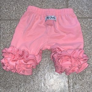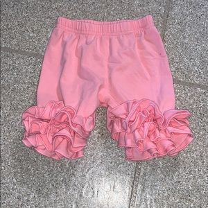 Pink ruffle bottoms. They are shorter more like longer shorts.