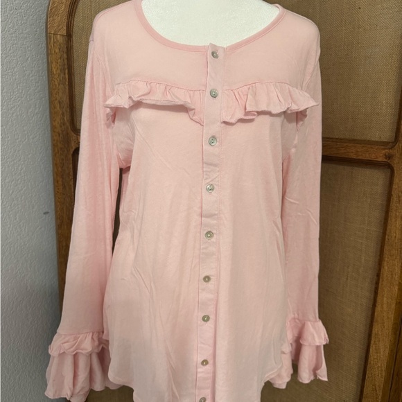 This elegant pink top features charming ruffles and a button-up design, perfect for adding a touch of femininity to your wardrobe.
