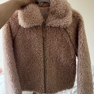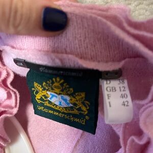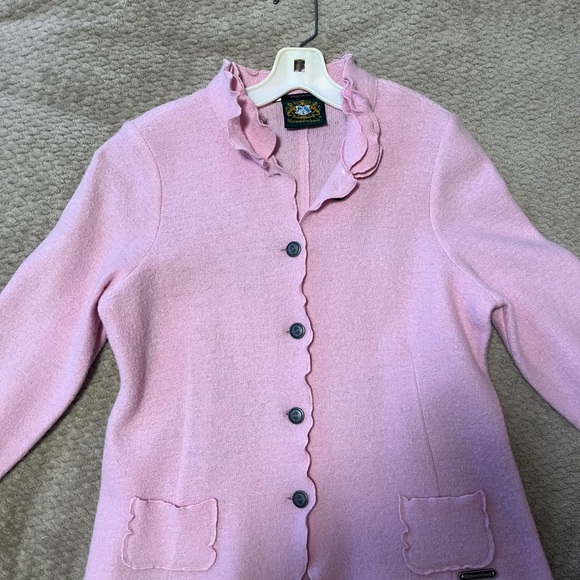 Elegant pink cardigan with ruffle details. Features button closure and front pockets. Perfect for a chic look. Only worn once! Hand embroidered and 100% wool.