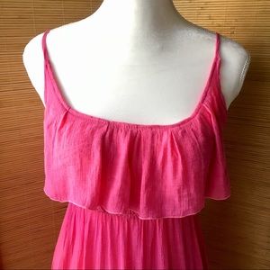 This beautiful pink dress features a ruffle top and bottom hem, adjustable straps with back and waist elastic bands that stretch to fit your body type. No size tag but like xs-s (0-4).