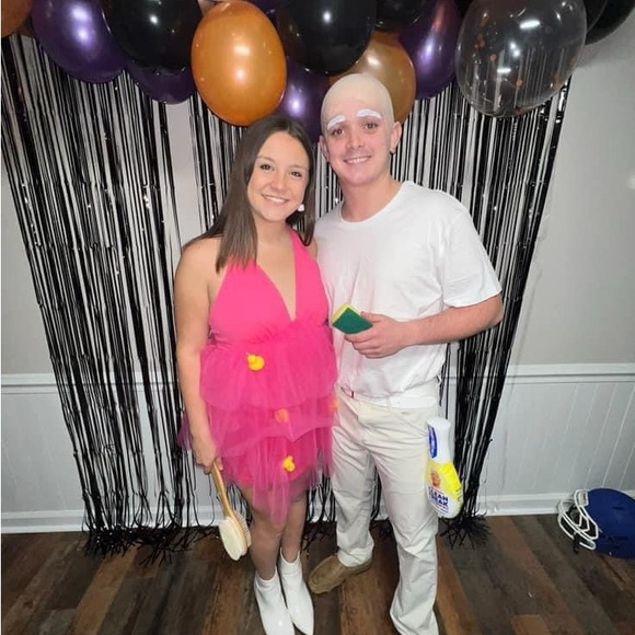 I purchased this dress from Ginny Marie’s Boutique! It wass used for a Mr Clean & loofah Halloween couple costume. Only worn for a few hours! Can be worn for a party dress, engagement or steal my idea for a costume! 🧽💕