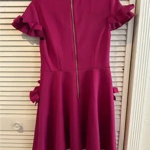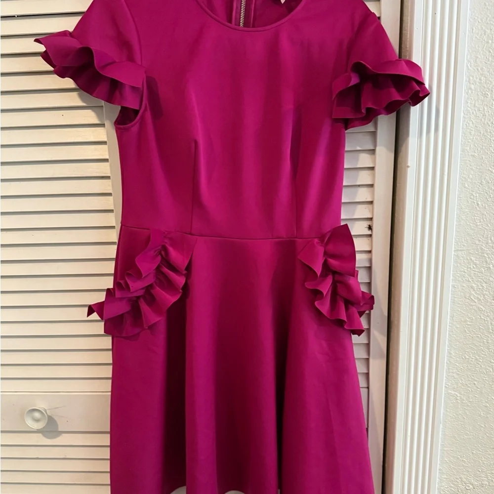 This charming pink dress features playful ruffle sleeves, perfect for any special occasion. Pockets, full rose gold zipper down the back. Ted size 3 / US 8
