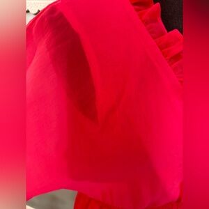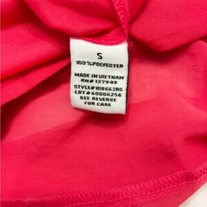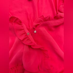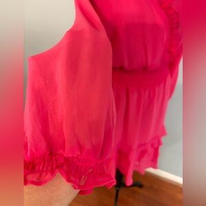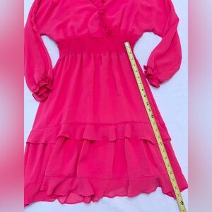 The dress is a long sleeve, V-neck, smocked-waist dress from the brand Emma & Michelle. It is a bright, hot pink (or power pink) color and features a ruffled neckline and hem.