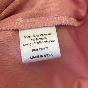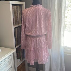 Dusty pink dress with metallic accents. Long sleeves with elastic smocked cuffs and waist. Ruffle and ties at neck. Tiered skirt. Fully lined. Size L. Worn once or twice, has a few loose threads.