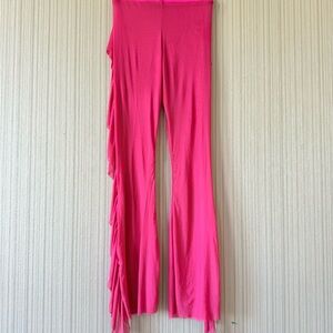 Bright pink flared leggings with cascading side ruffles. Stretchy waistband for comfort. Bold color and playful silhouette.