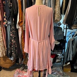 Asymmetrical pink dress with a stylish ruffle hem, adjustable sleeve, back keyhole, and waist tie.