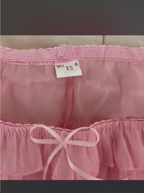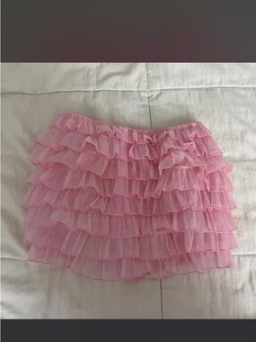 Soft pink layered ruffle shorts with an elastic waist and tie. Lightweight and feminine design for playful, casual looks. Comfortable stretch for easy wear and styling.