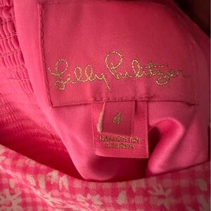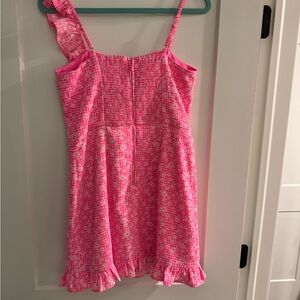Chic pink mini dress / romper with ruffle details. Zipper back closure. Only worn 2-3 times. Pink with white floral checkered pattern. Perfect for a stylish look.