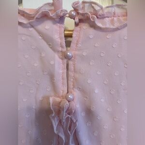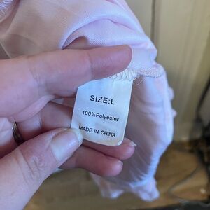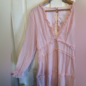This light pink flowy mini dress features delicate ruffles and a flattering design. It has a very deep v-neck and the back is open with three buttons to fasten it. The sleeves are full length. It has a zipper on the side to help with fit. Size is large and fits as a large. Brand unknown.