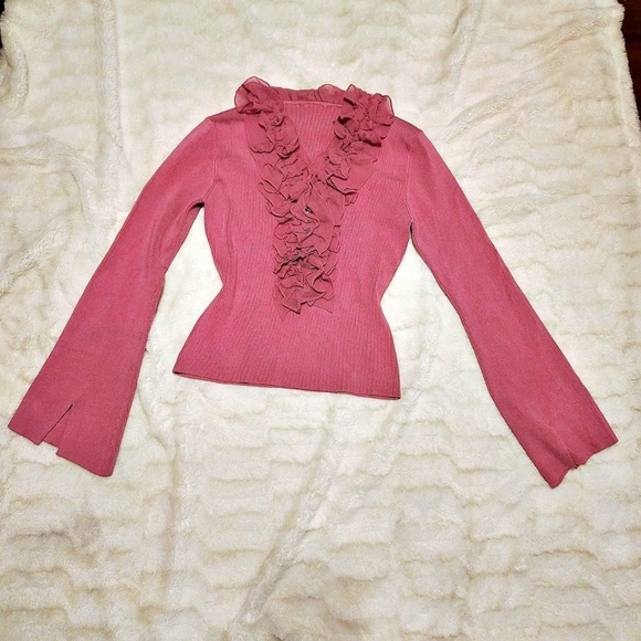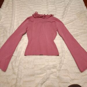 pink ruffle neck top with bell sleeves. made with a ribbed material that hugs the body really nicely. very fairycore or whimsigot