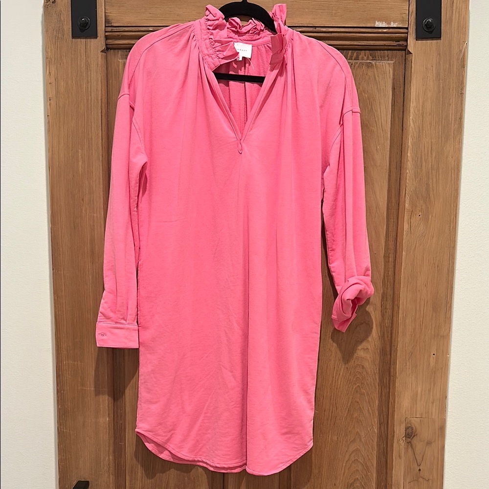 Stylish pink tunic dress with a ruffle neck. Perfect for casual outings.