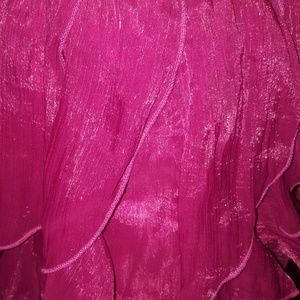 Burgundy Pink skirt with ruffles all around,which has a thick Black elastic band around the top. Sits right above knee. Has some fraying on the inner shell where the tag is(photo 4), but no holes.