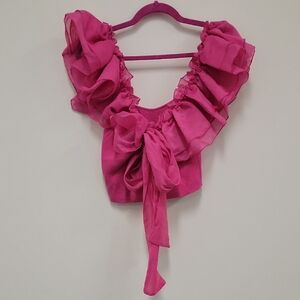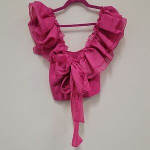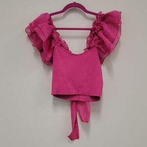 Chic crop top with ruffle sleeves. Vibrant pink color. Perfect for a stylish look.