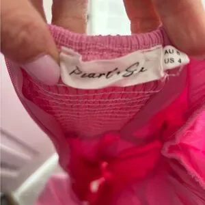 Soft pink cotton dress with short ruffle sleeves. White ric rac trim across the bodice. Flowy gathered skirt. Simple and sweet style.