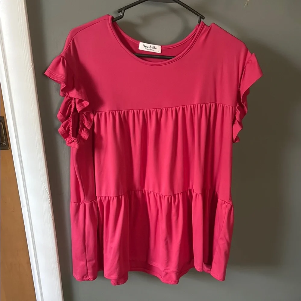 Elevate your style with the Pink Ruffle Sleeve Top. This chic top features playful ruffle sleeves and a vibrant pink hue, perfect for any occasion.
