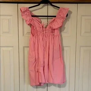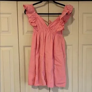 Charming pink dress with ruffle straps. Perfect for a casual outing.