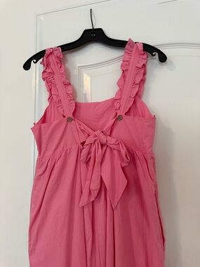 A bright pink jumpsuit with ruffle shoulder straps and a gathered waist. Soft, lightweight fabric for comfortable all-day wear. Easy pull-on style with a relaxed leg for effortless looks. Perfect for casual outings or dressed-up occasions.