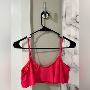 Bright pink ruffle swimsuit top. Features spaghetti straps and built in cups. Size Large.