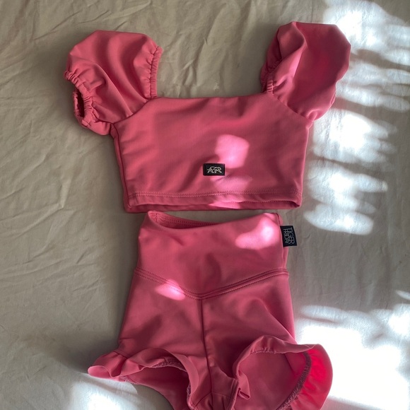 Stylish Tiger Friday soft pink dance top with ruffle sleeves and matching high-waisted shorts. Child’s size XS gently used but in great condition. See my closet for other dance sets