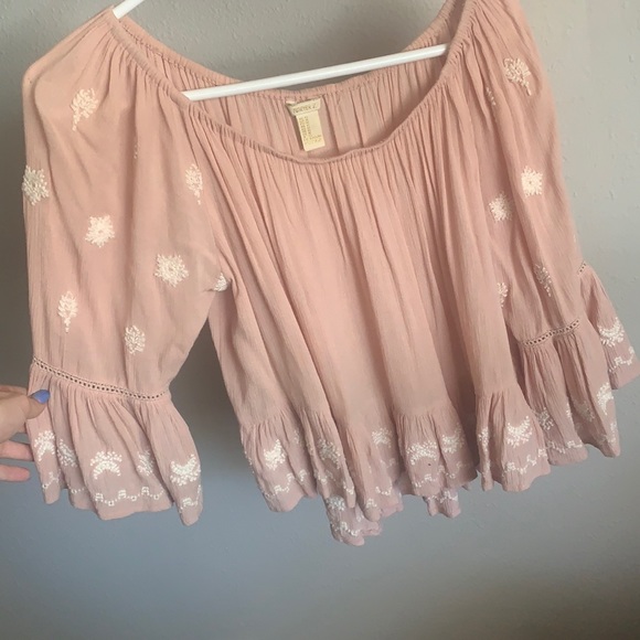 Cute light pink Ruffle top. Has white embroidery on it. Can be worn off the shoulder or on it.
